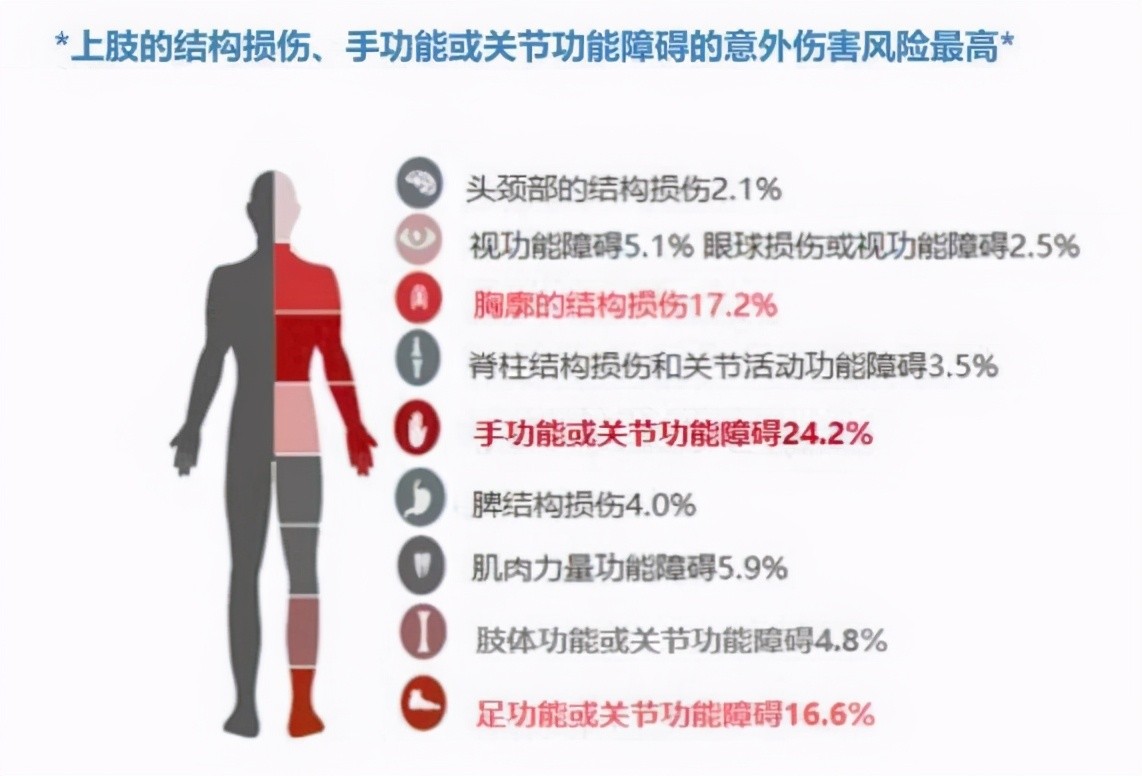 上面这份表格是意外身故的概率,但现实生活中,很多的意外不一定会导致身故,而是伤残。