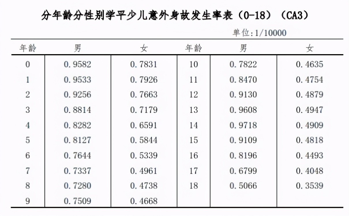 由于学生群体的特殊性,本表不同于普通人事故死亡率表。