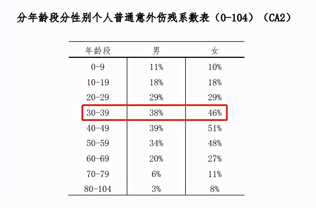 例如,30岁男性的残疾系数为38%,这38%可以理解为,保险公司每100万人意外死亡,就要为意外伤残支付38万美元。