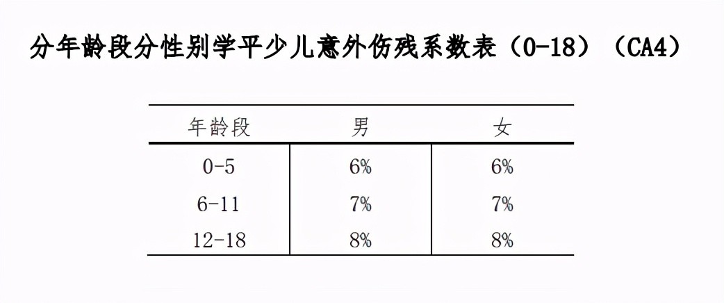 这是一个按年龄和性别划分的雪平儿童意外残疾系数表,与普通人意外残疾系数表类似,如果想了解某年龄段学平儿童意外残疾的发生率,只需按上述计算公式计算即可。此处不进行详细计算。