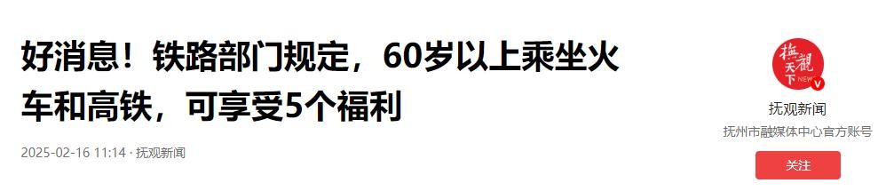 抚观新闻 2025-02-16——《好消息!铁路部门规定,60岁以上乘坐火车和高铁,可享受5个福利》
