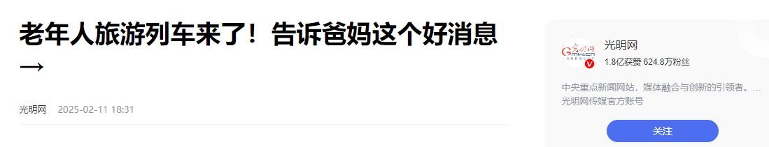光明网 2025-02-11——《老年人旅游列车来了!告诉爸妈这个好消息→》