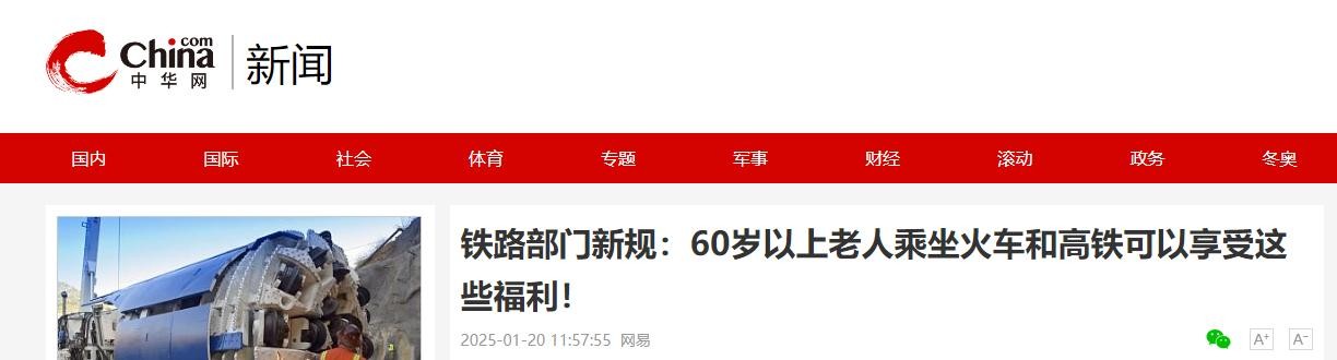 信息来源:中华网 2025-01-20——《铁路部门新规:60岁以上老人乘坐火车和高铁可以享受这些福利!》