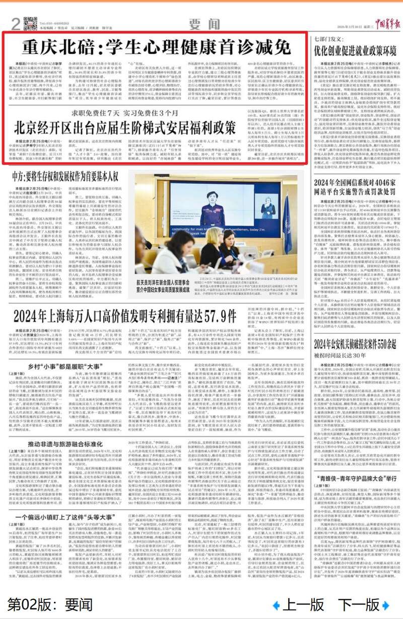 据中国青年报今日2版,记者近日从重庆市北碚区了解到,该区推出“学生心理健康首诊减免”项目,通过减免首诊费用、优化诊疗流程、提升服务质量等措施,降低青少年心理疾病就诊门槛。两个月来,已有70余名青少年诊疗费用被减免。