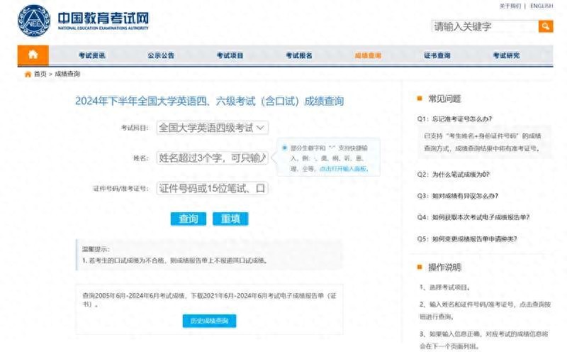 今日6时,2024年下半年全国大学英语四、六级考试(CET)成绩查询服务正式开通。考生可登录“中国教育考试网”官网或小程序查询考试成绩。忘记准考证号怎么办?已支持“考生姓名+身份证件号码”的成绩查询方式,成绩查询结果中将有准考证号。