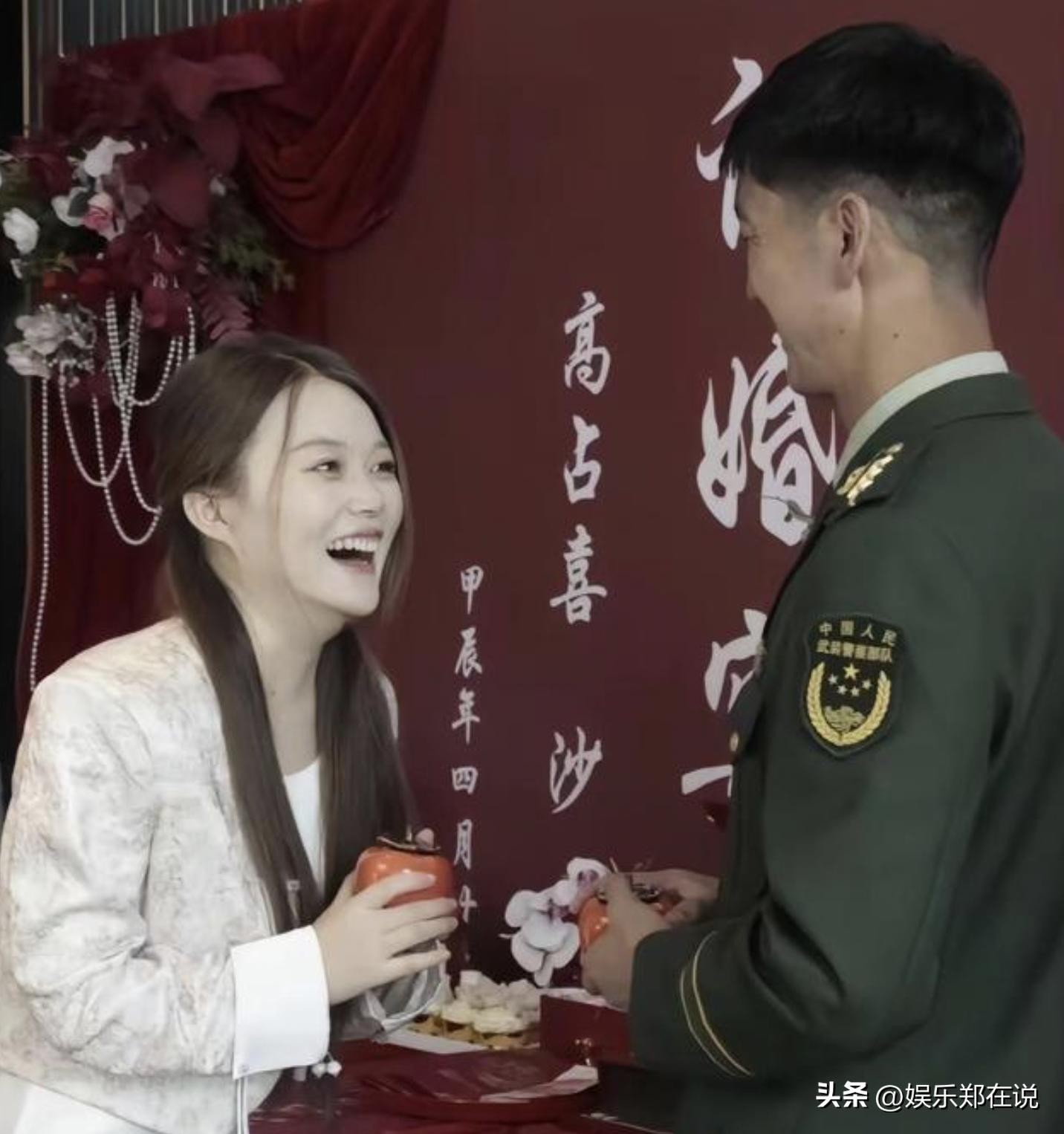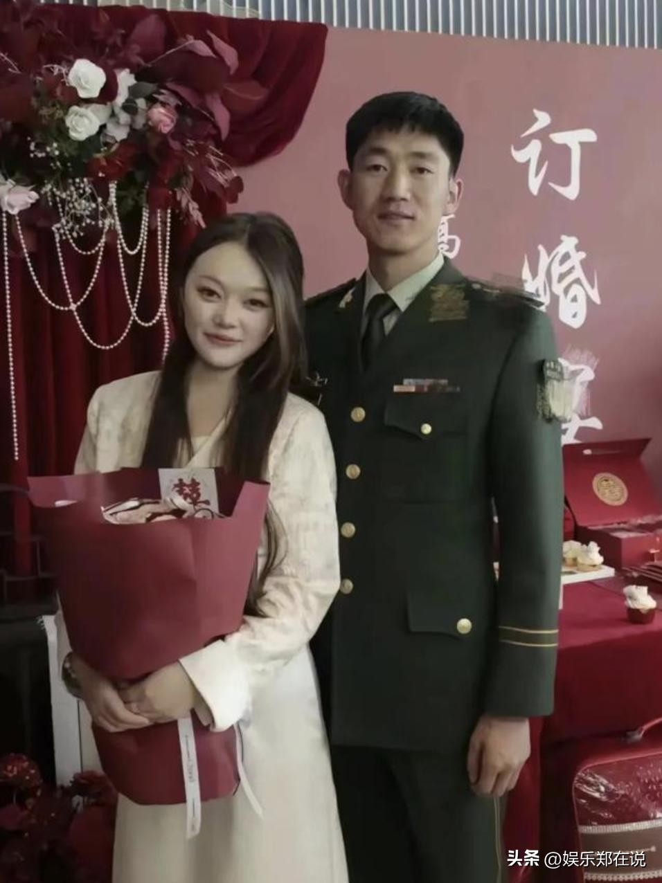 在曝光的照片中可以看到,高占喜身着挂着“上尉”肩章的军服,女方身着简单连衣裙抱着鲜花,身后则是“订婚宴”背景墙以及订婚喜庆套件。