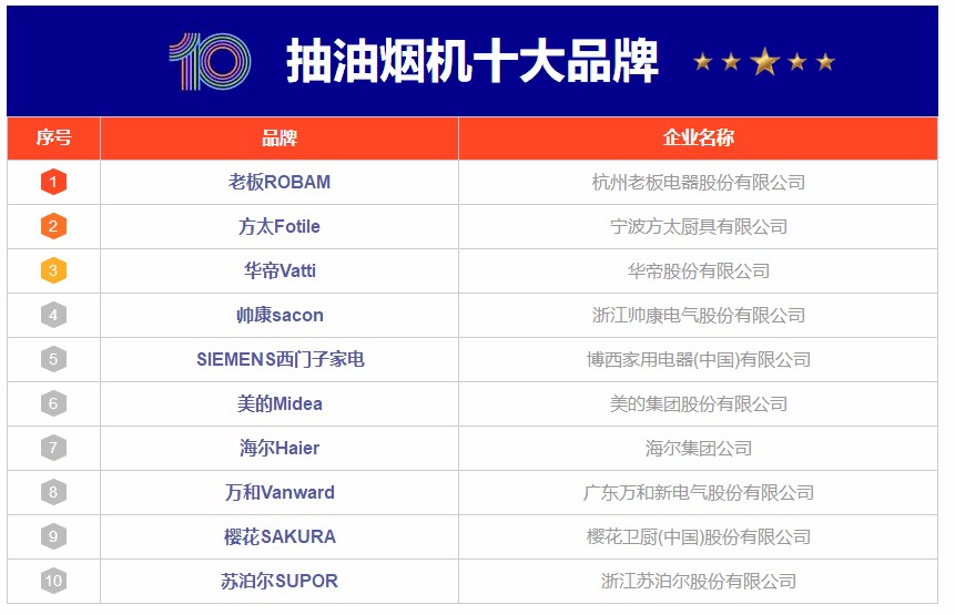 抽油烟机是家庭厨房必备的设备,它可以将烹饪过程中产生的油烟、异味、污染物有效地吸附、净化,使家庭厨房的空气污染物质减少,从而让家庭成员的健康得到有效的保护。那么抽油烟机什么牌子好?下面,小编为大家分享抽油烟机十大品牌排行榜,包括老板ROBAM、方太Fotile、华帝Vatti、帅康sacon、SIEMENS西门子家电、美的Midea、海尔Haier、万和Vanward、樱花SAKURA、苏泊尔SUPOR等。该榜单由CNPP品牌榜中榜大数据研究院和CN10排排榜技术研究院专业测评而得出,排名不分先后,仅供借鉴参考。