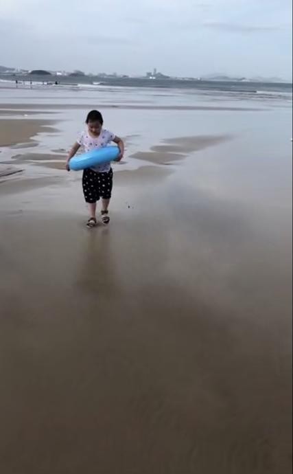 7月5日,男租客给女孩父亲发了一段孩子在海滩玩耍的视频,以证明孩子的安全。15秒的视频中,章子欣穿着粉色短袖、黑色短裤和黑色凉鞋,双手腰间挂着蓝色游泳圈,在海边的沙滩上奔跑玩耍。