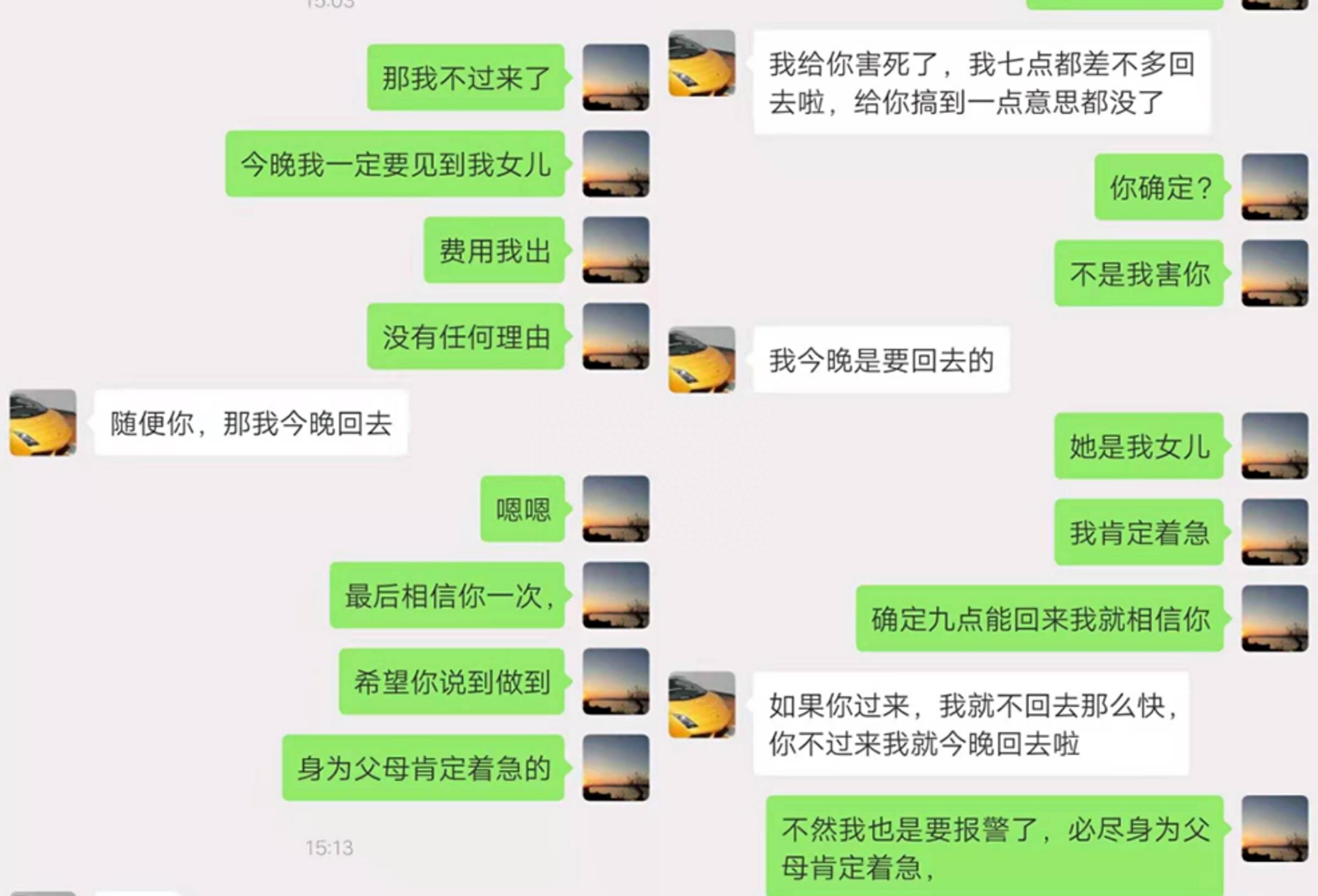 聊天记录显示,7日下午3:00后,张军开始紧张,担心地对对方说,“今晚我得见我女儿……不然就报警。”