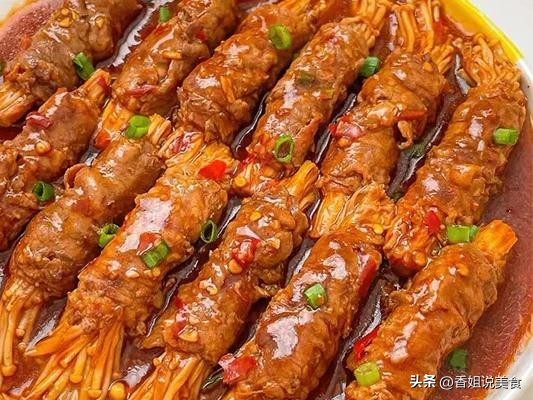 3、起锅烧油,油热后放入葱蒜末炒出香味,再放入豆瓣酱炒出红油,然后再放入金针菇肥牛卷煎出香味,再倒入酱汁焖煮,煮至酱汁浓稠即可出锅装盘,撒上葱花即可上桌开吃。