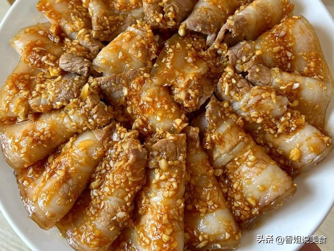 3、煮熟后盛出放凉,再切成薄片摆放在盘子上,最后淋上提前备好的酱汁即可上桌开吃。