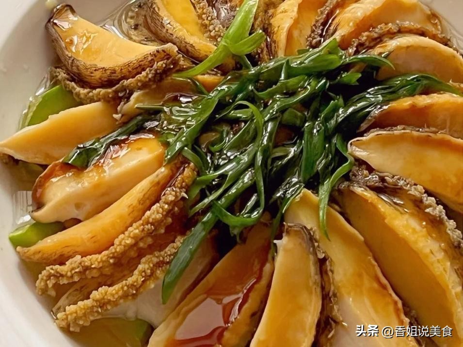 3、摆上葱段,淋上葱油汁即可上桌开吃。鲍鱼下面可以先垫一层西葫芦片。