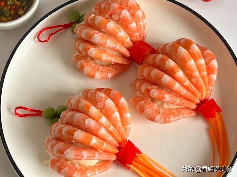 2、山药去皮后切成段,放入锅中蒸熟,然后趁热压成泥,再揉成半圆放入盘中,再摆上虾仁摆成灯笼,最后摆上豌豆粒、红绳、胡萝卜丝、红椒。