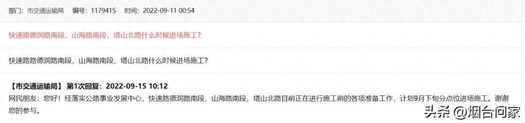 根据烟台市交通运输局最新答复,快速路德润路南段、山海路南段以及塔山北路,计划于9月下旬分点进场施工。