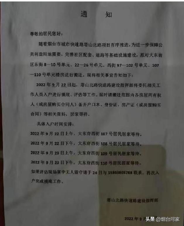 另据网友爆料,近期塔山北路快速路建设指挥部发布了远林夼部分单元楼房的搬迁事宜。