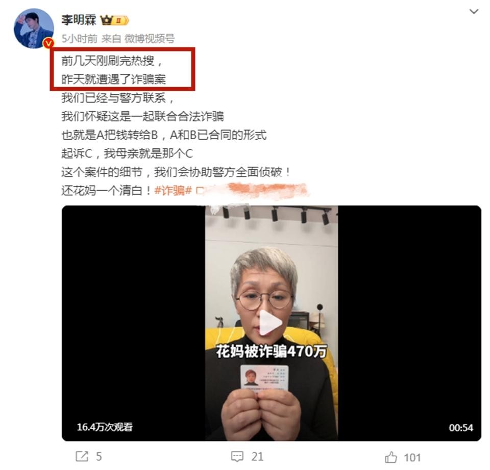 近日,歌手李明霖的妈妈实名举报两位河南人诈骗她470万元,再次引发了公众对于地域歧视和诈骗问题的关注。李明霖妈妈称这两人以她的名义签订了一份商业合同,并将300万元的合同款项私自转入个人账户。此事件发生后,李明霖妈妈已向警方报案,并向法院提起上诉。