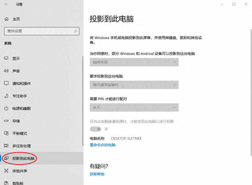 然后在左侧菜单栏中找到“投影到这台电脑”,打开系统接收投影设置。(如果打不开,检查电脑驱动是否更新)