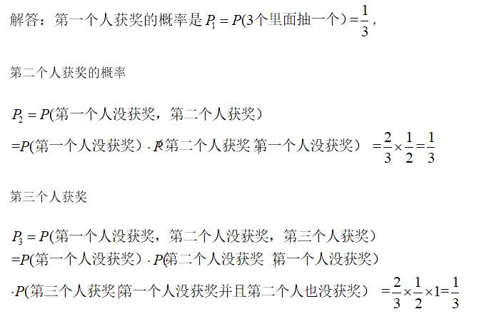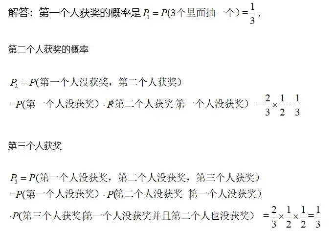 这让我想起一道经典的题目,是关于抽签公平性的:有3个人抽取1个获奖名额,三个抽签中只有一个是获奖的,采用轮流不放回抽奖的方式,试问最后一个人抽奖是不是获奖概率最低?