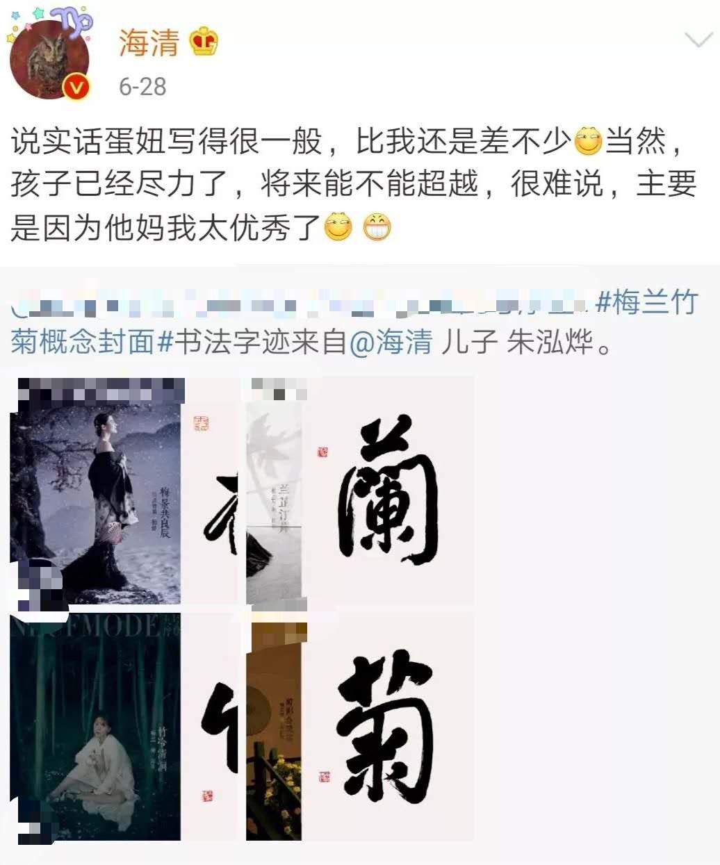 可能很多人都知道蛋妞写了一手好字,从小就练习书法,最近一个关于梅兰竹菊的杂志封面图文字也是由海清的儿子手写的,海清还十分谦虚地说儿子写得一般,但是已经尽力了。