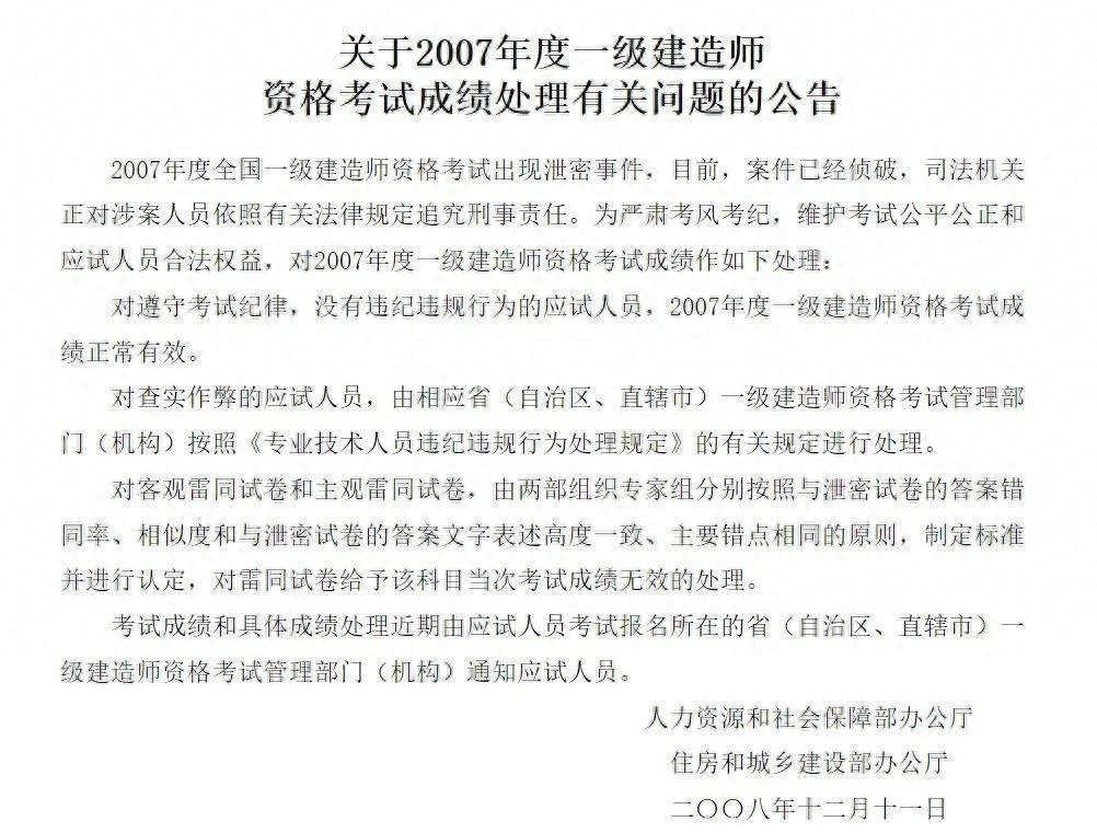 考卷泄密事件之后,考试成绩推迟发布,大量考生担心考试成绩作废,不断向有关部门咨询。直到08年12月11日,官方才发布通告,08年一建考试也就一直没有进行,09年方才恢复正常。