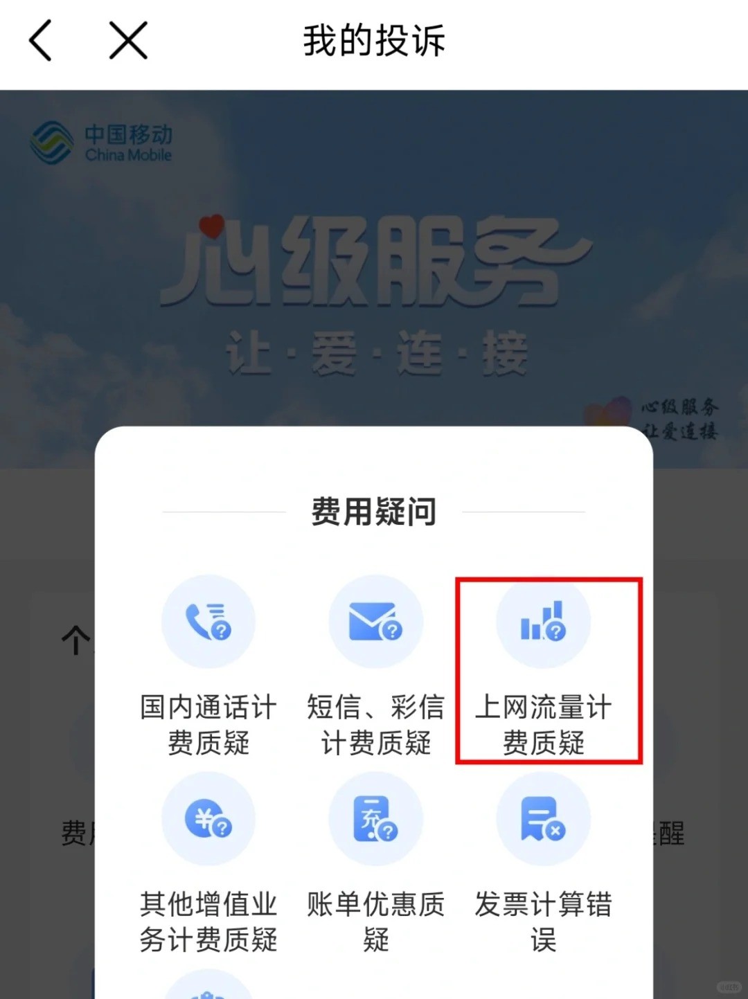 ②在跳转的页面点击【费用疑问】-【上网流量计费质疑】