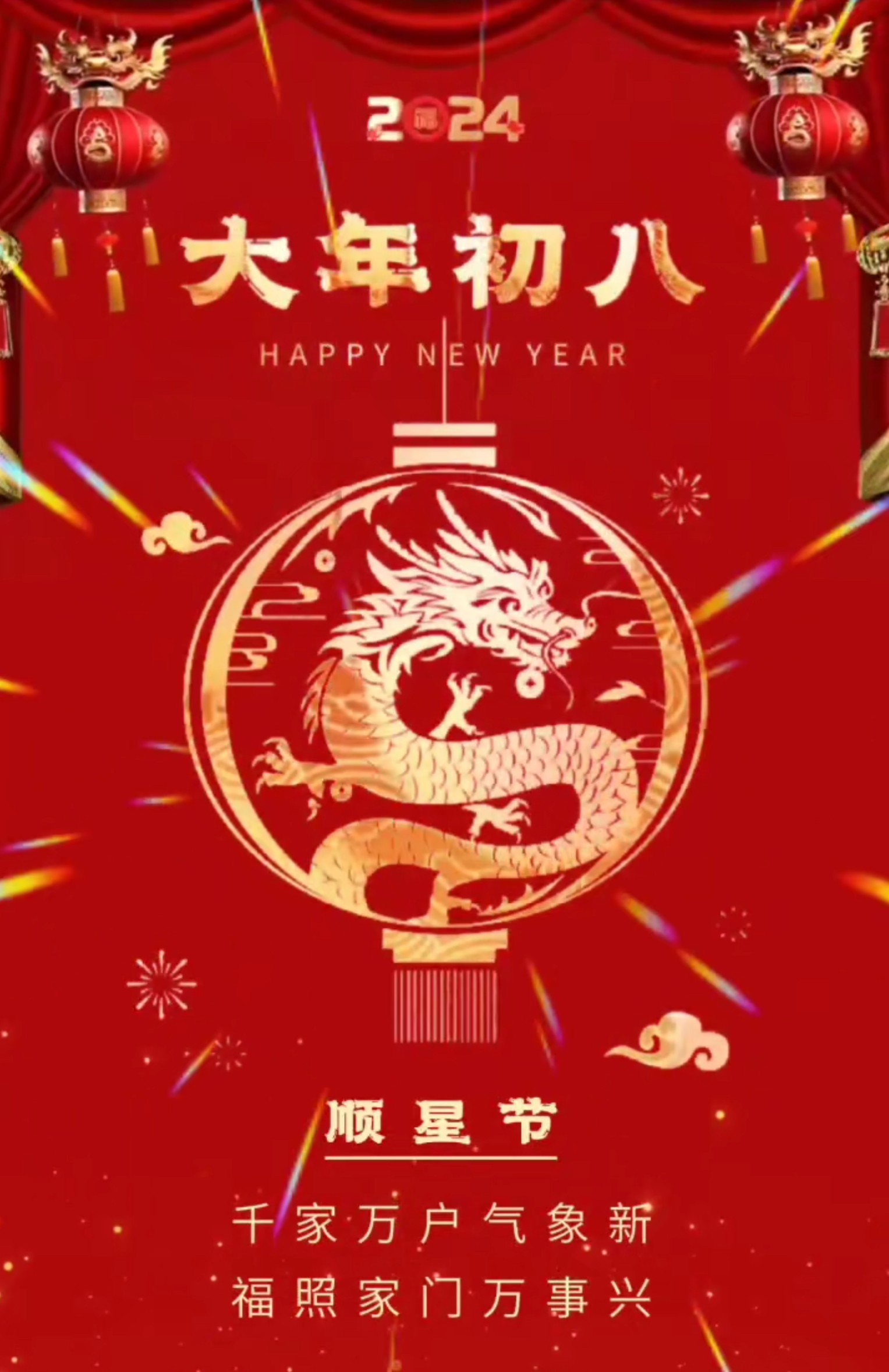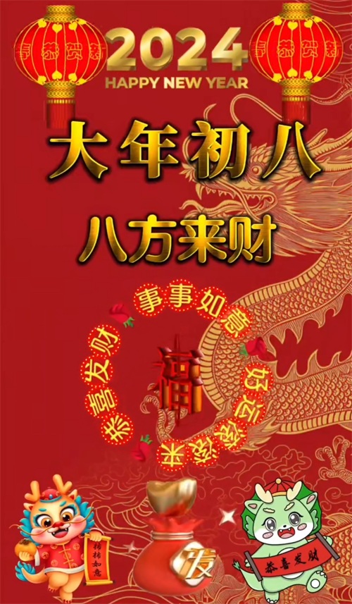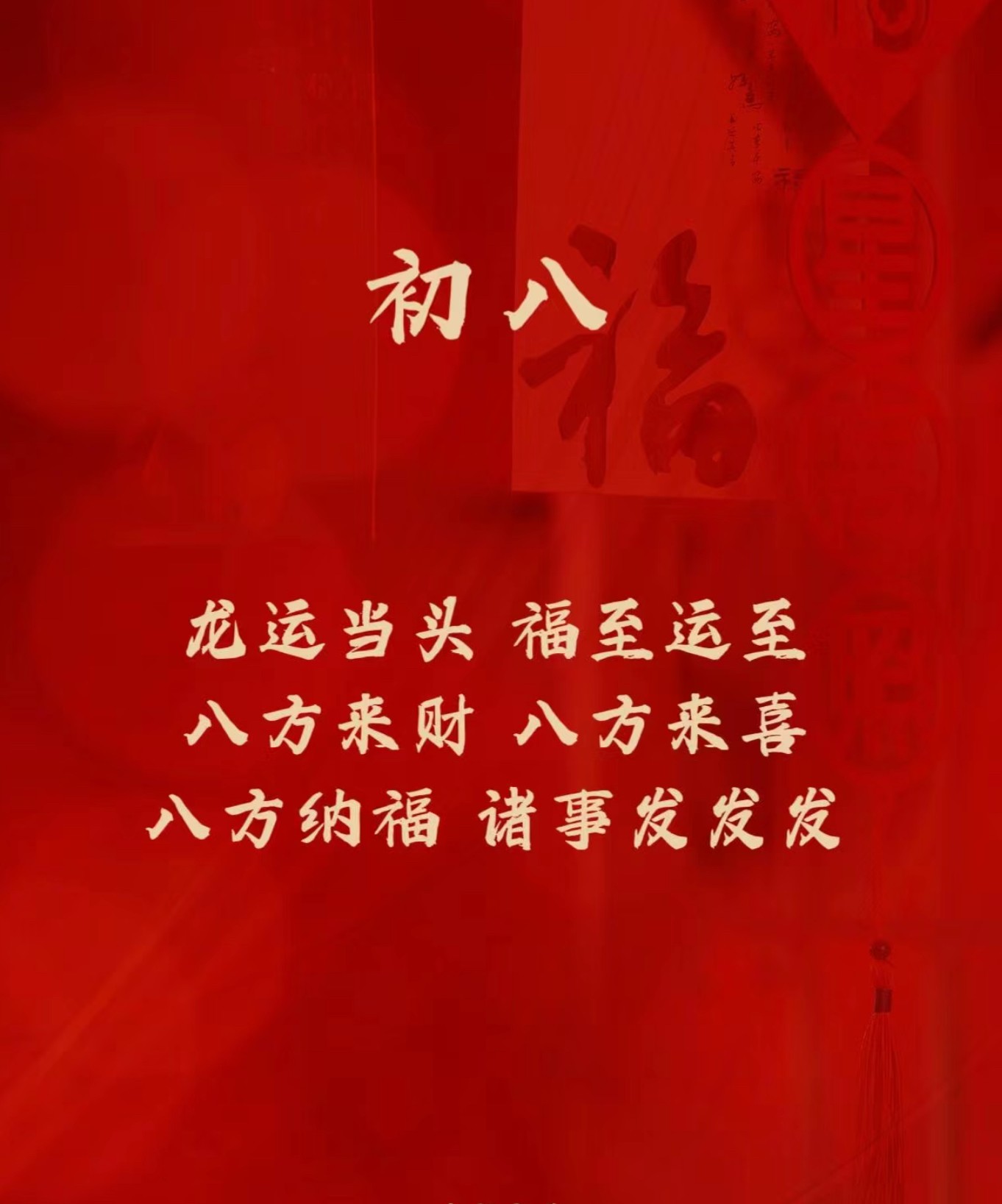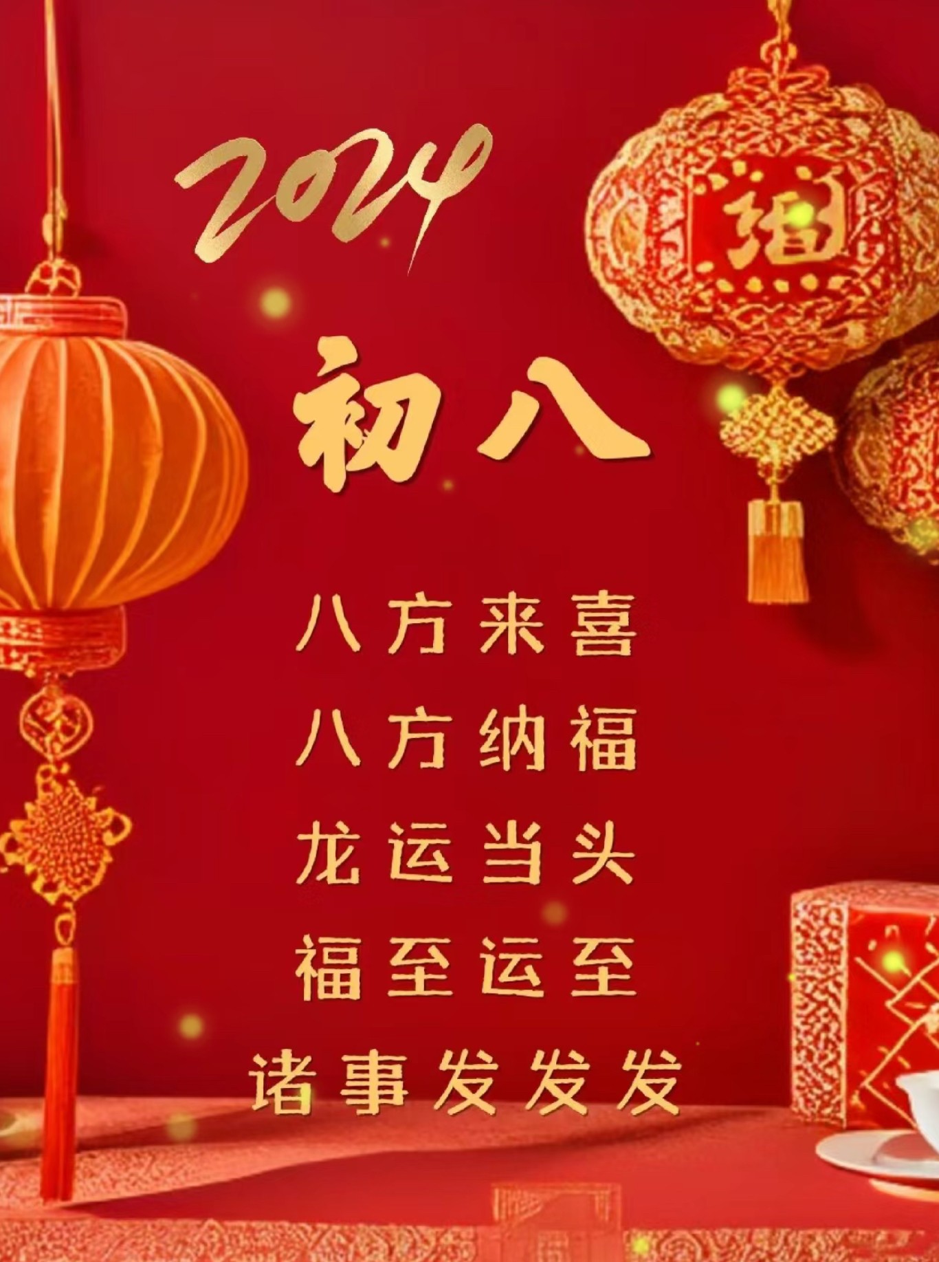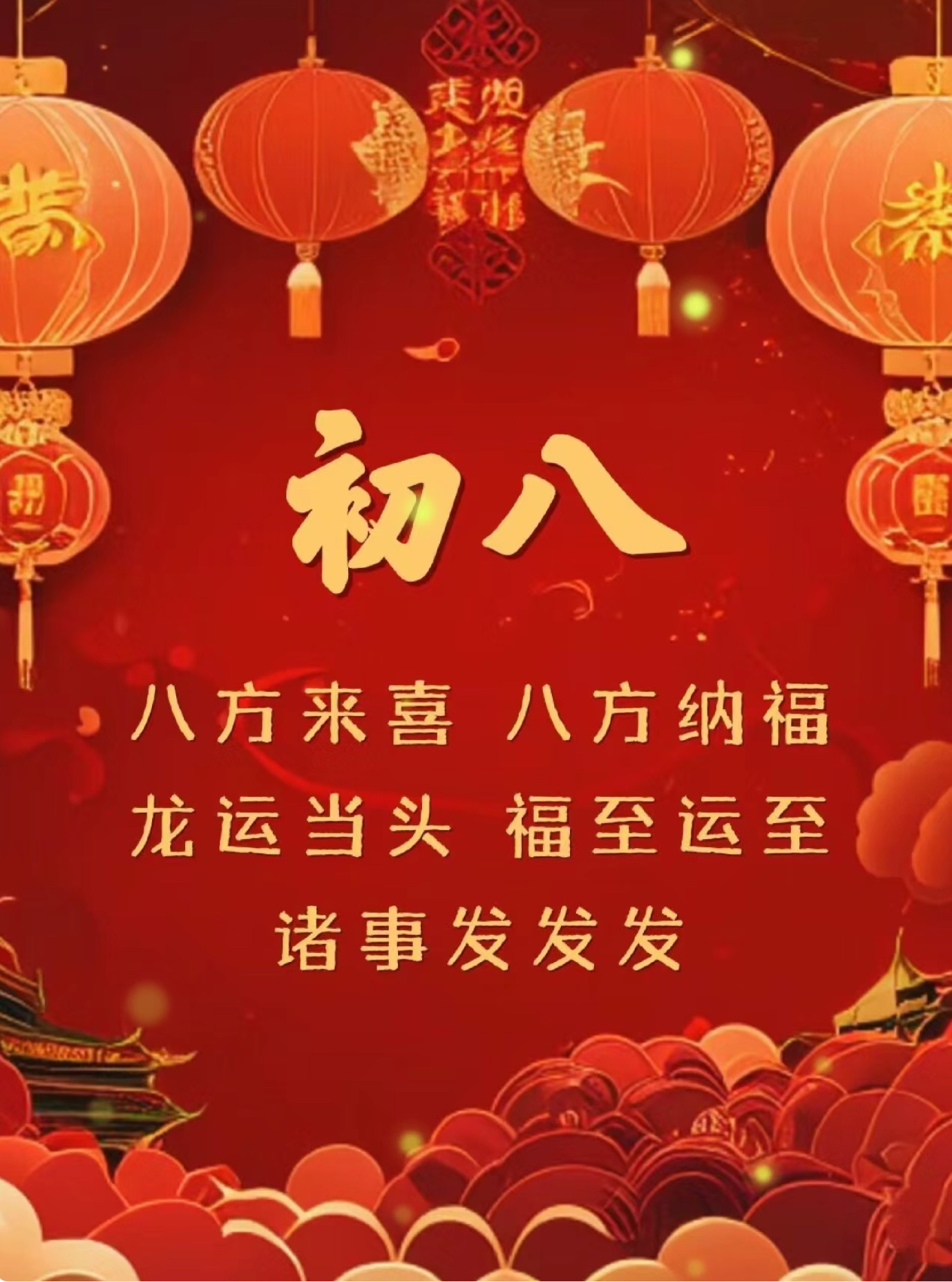 正月初八,八方来财,八方来喜,八方纳福,诸事发发发!恭祝您福星八方照,龙行天下好运招!福龙送吉好运到,富贵荣华福如海!愿国泰民安,风调雨顺!