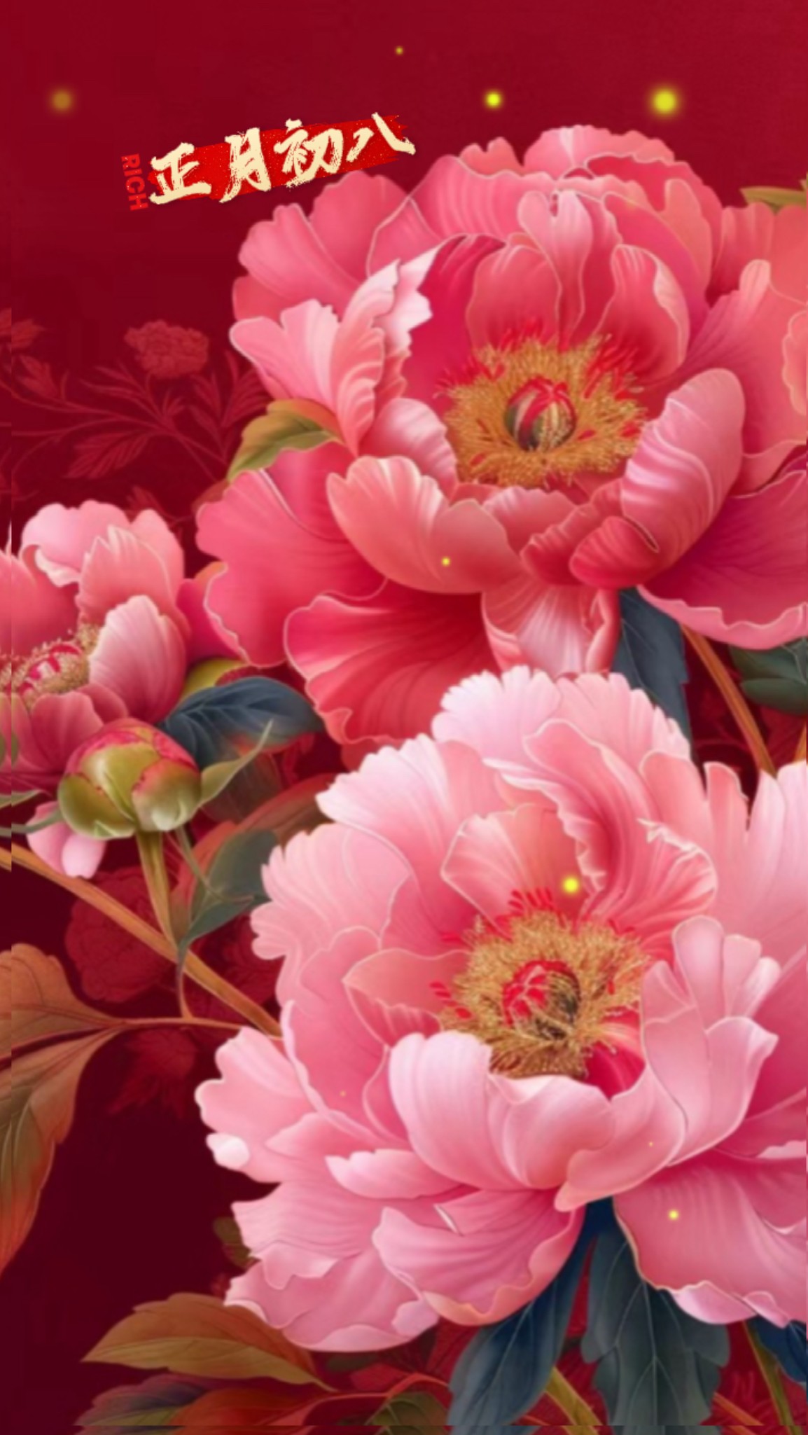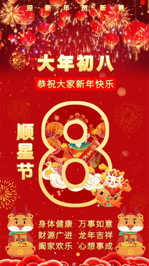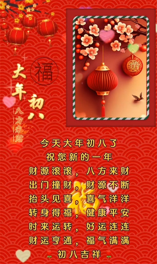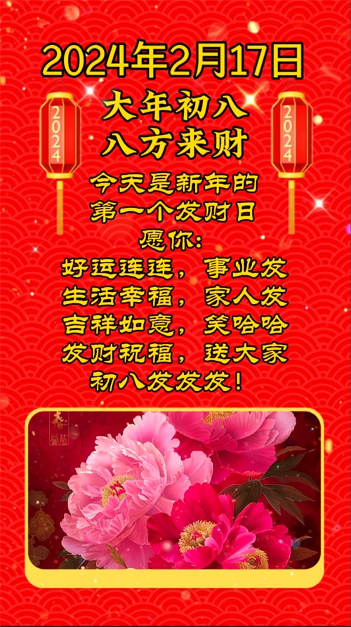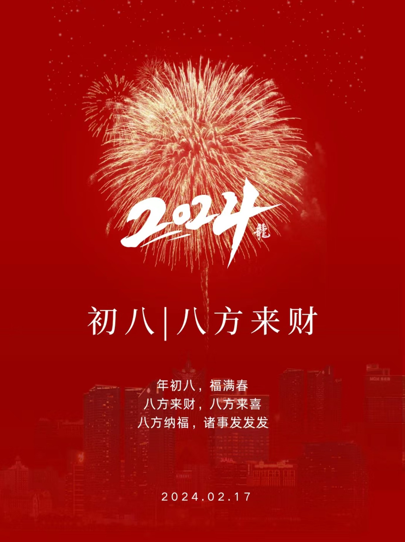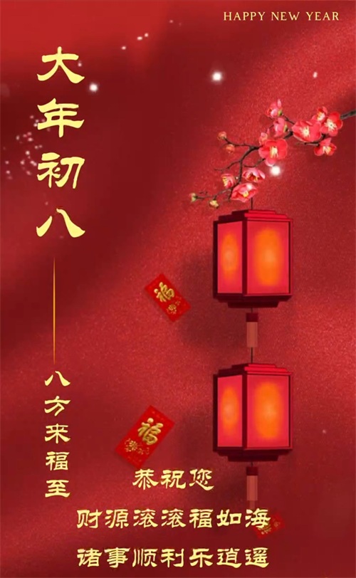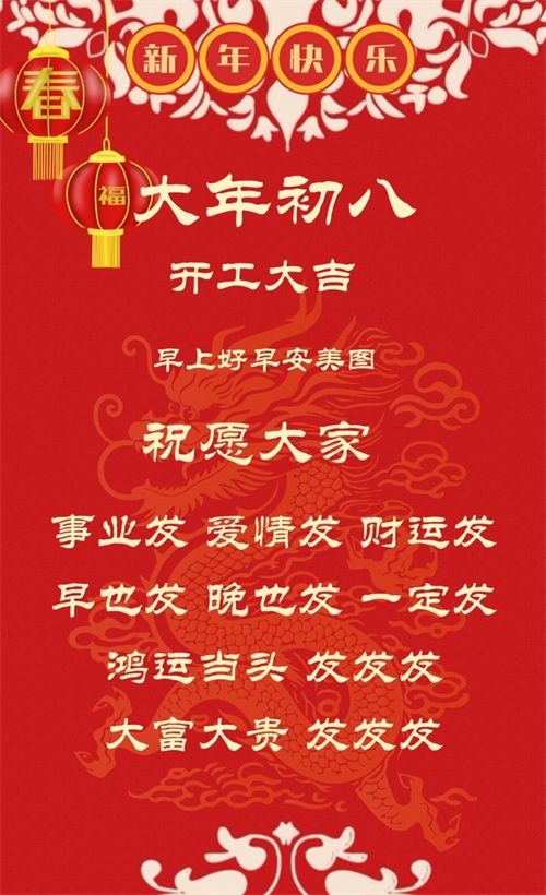 正月初八,八方来财,八方来喜,八方纳福,诸事发发发!恭祝您福星八方照,龙行天下好运招!福龙送吉好运到,富贵荣华福如海!愿国泰民安,风调雨顺!