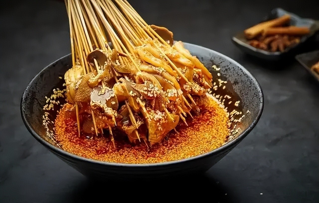 钵钵鸡是一道极具川菜特色的冷拌菜肴。口味麻辣鲜香中,微微带着点酸甜,风味独特。