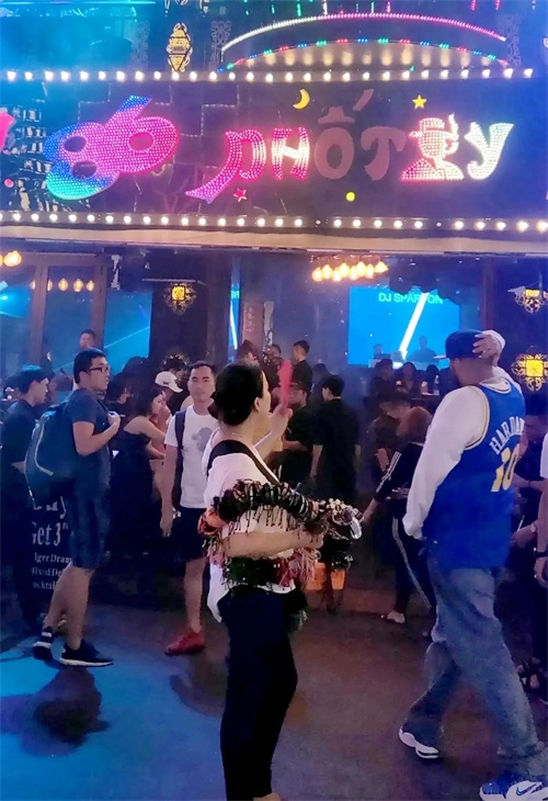 这里白天静悄悄的一到了晚上客人蜂拥而至五彩迷离的灯光,劲爆的音乐,妖艳的美女,糟杂的人声,卖各式东西的小商小贩,酒吧接待的小哥哥小姐姐都在大街上吆喝揽客。