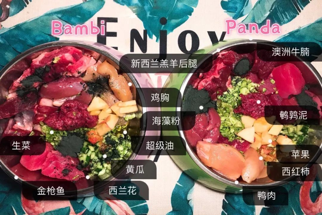 配方1:鸡肉/火鸡肉200克、米饭/糙米200克、鸡蛋2个、胡萝卜1根、青菜100克、、骨粉适量(矿物来源)、鱼肝油适量(维生素来源)、海藻粉适量(钙来源)。