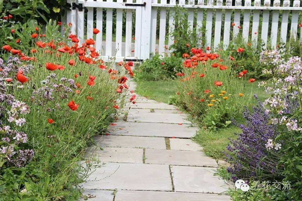 (下图:红色的一年生虞美人,种在小路两旁,很有英国别墅风味。)