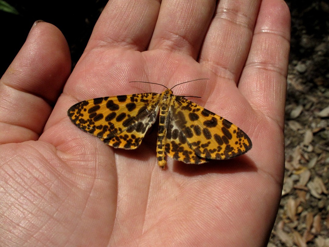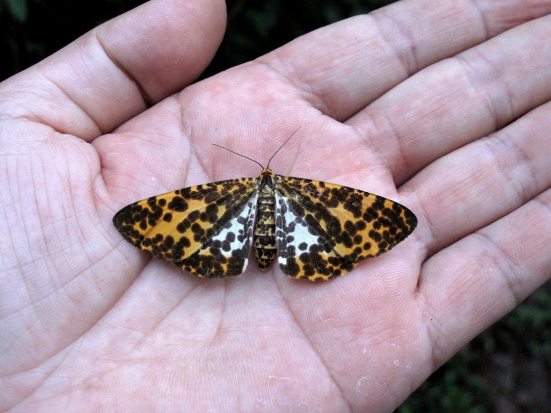 大斑豹纹尺蛾(尺蛾科),一种很常见蝶形蛾,不仅翅膀色彩花哨,虫体的颜色同样明亮,属于蛾子中的另类。