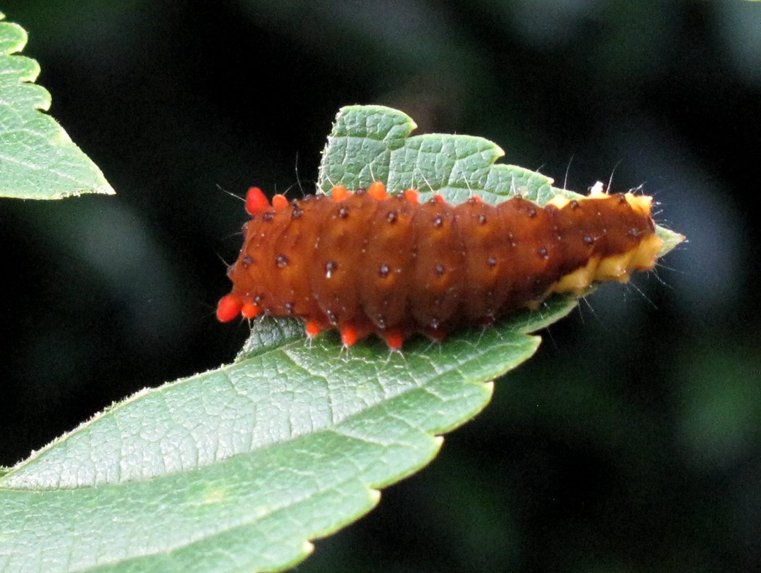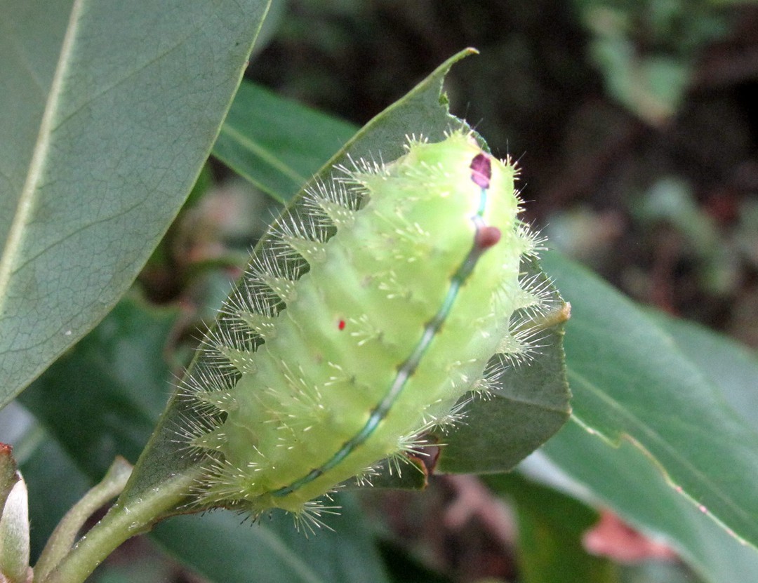 茶足点刺蛾幼虫(刺蛾科),属于扁刺蛾属的种类,它们一点儿不挑食,几乎在所有的木本植物上都有其踪迹,因此对农林业的危害是很大的,体表密布的毒刺,使其少有天敌,这只正在啃食木荷的叶片。
