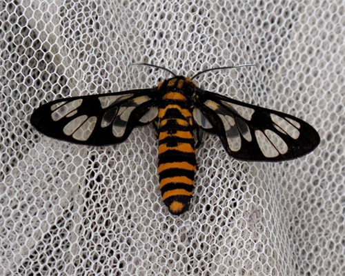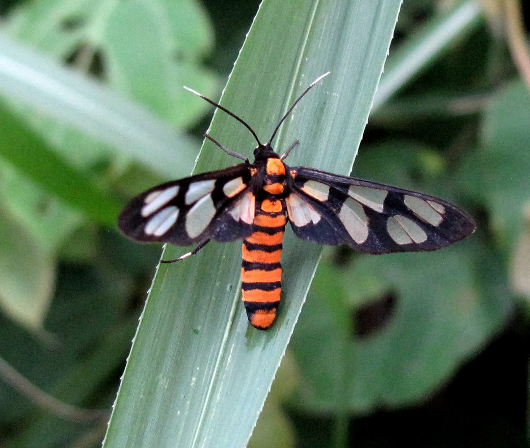 明鹿蛾(鹿蛾科),鹿蛾科是一类模拟蜂类的有毒蛾子,翅膀狭长,并有透明区域,腹部醒目的黄白相间的图案是种典型的警戒色,因此它们的行动往往比较迟钝。