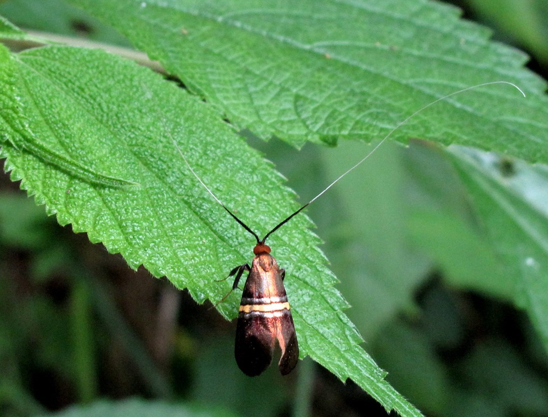 横带长角纹石蛾(长角石蛾科),其触角出奇的长,很容易让人误以为也是种长角蛾,但其翅膀上没有鳞片,只有不明显的毛茸,显然是种毛翅目的石蛾种类。