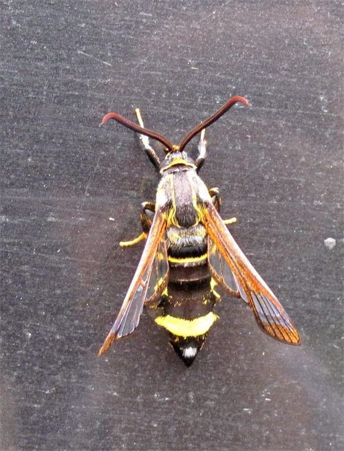 它出现在五龙潭景区内,当时它停栖在我的车门上,开始我还以为是只胡蜂,凑近观察发现不是蜂类,应该是一种拟态成蜂类的蛾子,看上去它没有蜂类那样的警觉,一直停在那儿不动