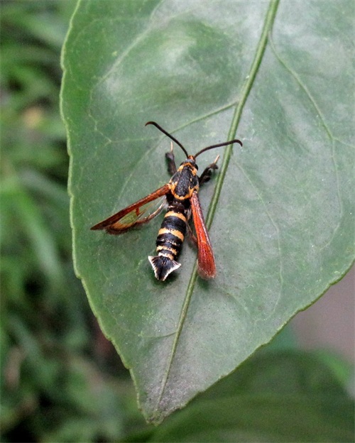 后来我又在别处拍摄到樟帕透翅蛾和金蜂透翅蛾。这些透翅蛾科的蛾子比较罕见,是典型的模拟蜂类的蛾子,由于蜂类都是比较凶猛的昆虫,它们不仅有尾部的毒针,头部的大颚也是相当厉害的,因此把自己伪装成蜂类是相当巧妙的生存策略。有一类食蚜蝇,属于苍蝇的近亲,它们的另一个名字叫“拟蜂蝇”,也是采取相同的拟态方法来吓唬天敌的。蝇类与蜂类在形态上原本就差不多,拟态起来只要作细微的调整即可。而蛾子与蜂类的差距着实有点大,但透翅蛾科的种类照样能模仿得惟妙惟肖,那是很不容易的,这无疑是蛾类中的奇葩类群。有意思的是,金蜂透翅蛾是在城区内被发现的,原来我们身边有时就潜藏着某些特别的昆虫种类呢!