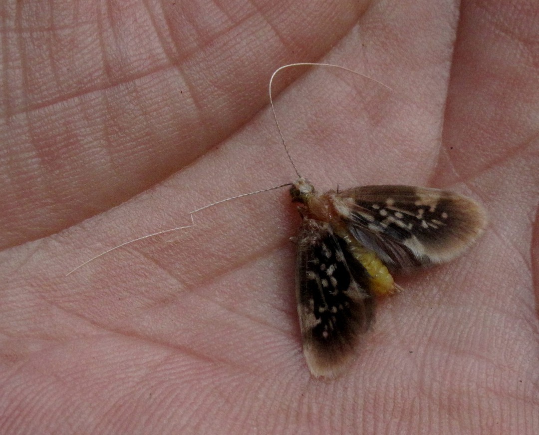 黄纹长角蛾(长角蛾科),长角蛾科是一种原始的小蛾子,以触角极其细长而得名,其雄性触角一般能达到翅长的3倍,其触角非常坚韧,很难折断,飞行姿态很怪异,类似蜉蝣那样的忽上忽下,个体虽小,但其翅膀上具有金属光泽,色彩非常艳丽。