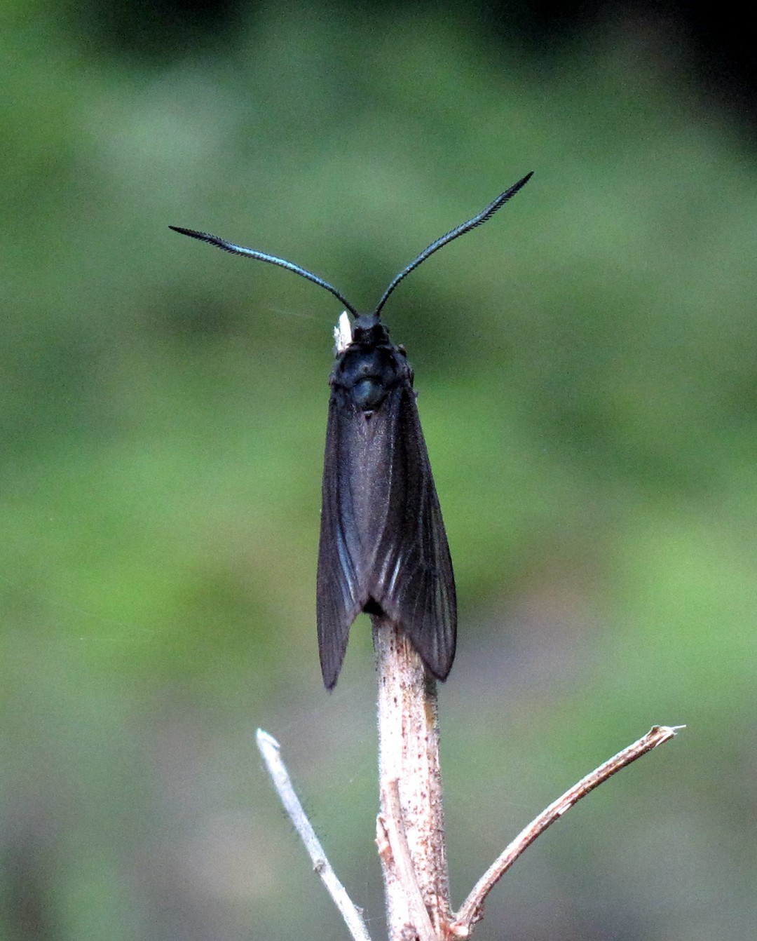马汀氏竹斑蛾(斑蛾科),触角呈现深蓝色,翅膀通体黑色,外形上与新鹿蛾有点相似,但触角的形态又像鹿蛾的。