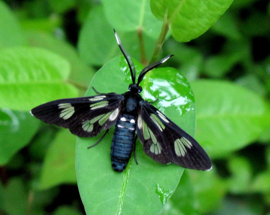 清新鹿蛾(鹿蛾科),粗看上去与前面的明鹿蛾似乎差不多,其实它的腹部背面有一黑色纵带,翅膀的透明区域图案也是略不相同的。