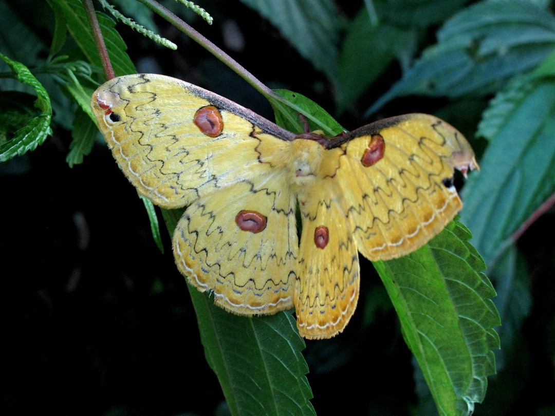 黄豹大蚕蛾,个体硕大,图案华丽精美,每片翅膀上都有一枚醒目的眼斑,属于观赏性的大蛾子,美感决不输于蝴蝶。