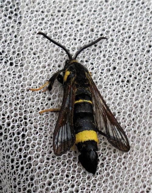 金蜂透翅蛾(透翅蛾科),从其名字中可以看出是种拟态金蜂的蛾子,这个种类居然出现在城区的绿带中,太让人意想不到了,原来城区也会有奇葩的蛾子出现。