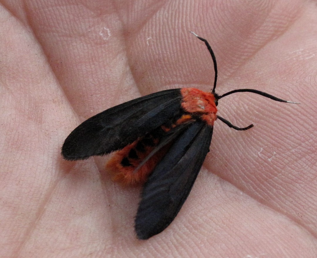 毛斑蛾(斑蛾科),浑身披毛,翅膀纯黑色,且头部呈红色,颜色对比特别强烈,是种典型的警戒色,表明其毒性剧烈。