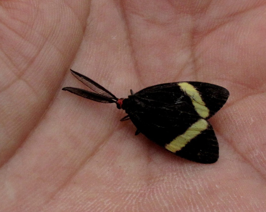 萱草带锦斑蛾(斑蛾科),它们白天会在林间活动,一种小型的斑蛾,黑色翅膀上有醒目的黄色条带,加上红色的头部,也是种警戒色。