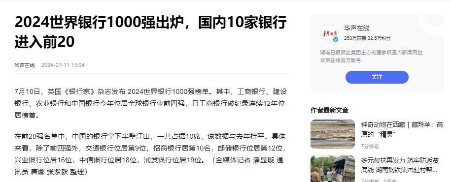 华声在线:2024世界银行1000强出炉,国内10家银行进入前20