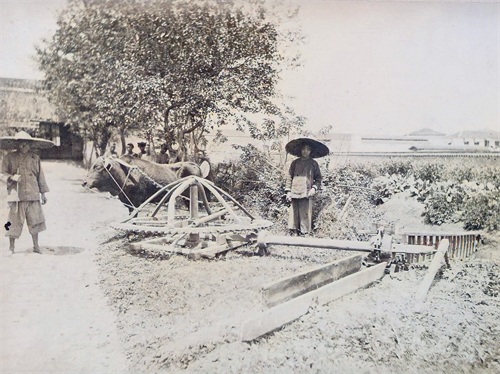 牛力灌溉系统。图中是使用链泵,通过人力或牛力驱动,链泵通过齿轮传动来抽水。
