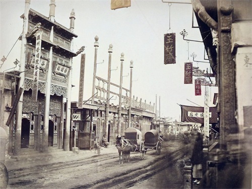 作者照片介绍所拍摄的乃是:“北京的雨季,干燥天气里的尘土被一层绵软厚实的泥巴所替代。车轮于街道之上压出深深的车辙,商铺的门面以油漆和金箔加以装饰,然而这些房子看上去更似临时的棚屋,而非稳固的住所与商店。”