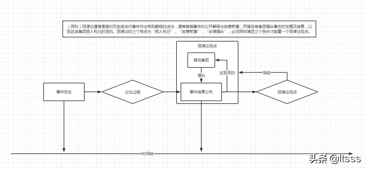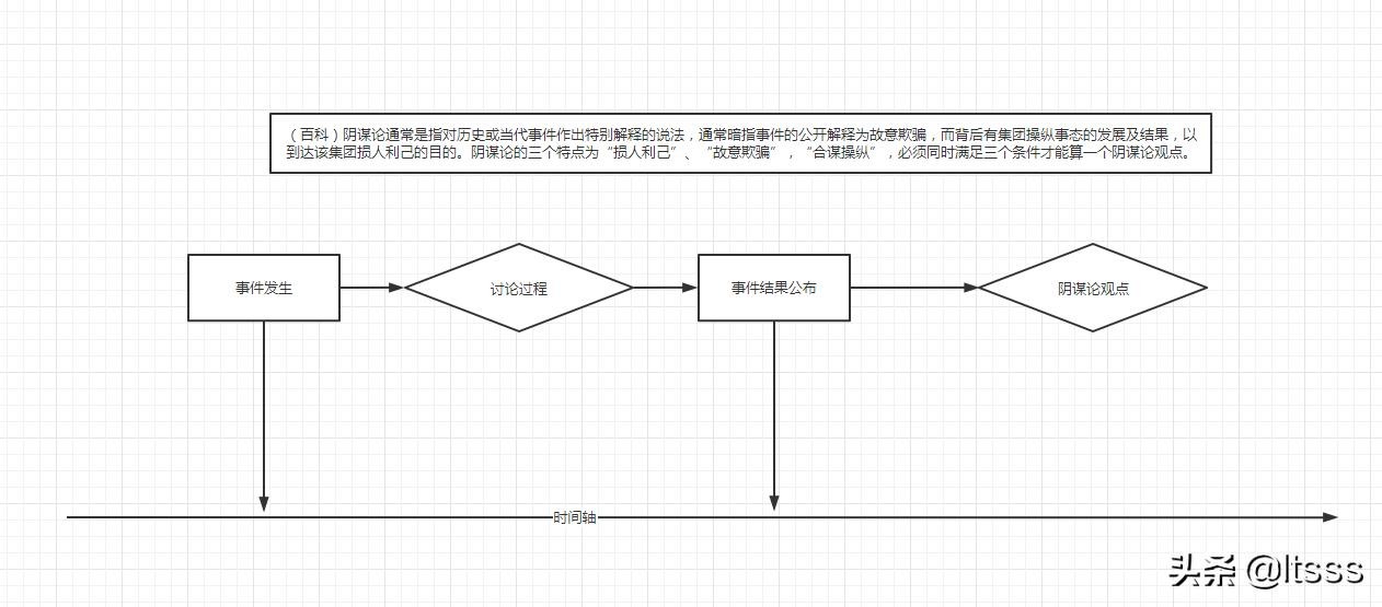 那么我们再回到阴谋论的解释中来:“阴谋论通常是指对历史或当代事件作出特别解释的说法,通常暗指事件的公开解释为故意欺骗”。这里提到阴谋论是暗指公开解释为故意欺骗,也就是说,从时间轴上来看,阴谋论的观点是在“事件结果公布之后”。