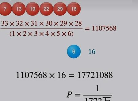 随后呢,我们再在16个蓝球中选一个,有16种方法,这样一来呢,双色球的组合一共就有1107568*16=17721088种可能,买一注双色球只有一种组合,所以中头奖的概率大约是1772万分之一。