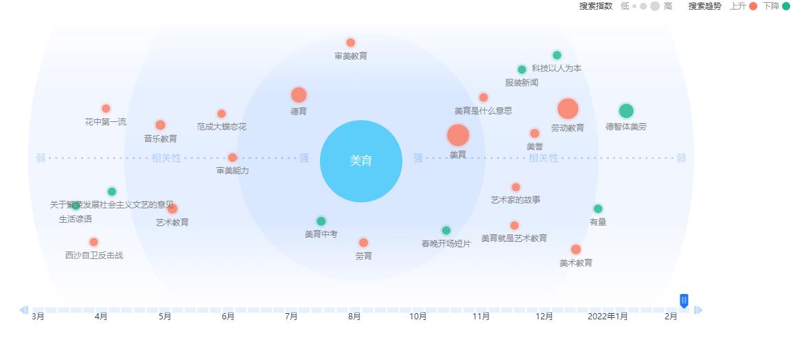 据百度指数显示,关键词“美育”的搜索指数及关联词“艺术教育”、“德育”等,搜索趋势整体为上升趋势。因此,随着教育的不断改革,美育的重要性不言而喻。